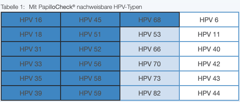 Der PapilloCheck® ist PCR-basierter DNA-Chip-Test, der HPV-Viren nachweist und genauer identifiziert (Genotypisierung). Folgende 13 Hochrisikogruppen, 5 sogenannte Intermediärrisikotpyen und 6 Niederrisikotypen können dadurch getestet werden (siehe Tabelle 1)